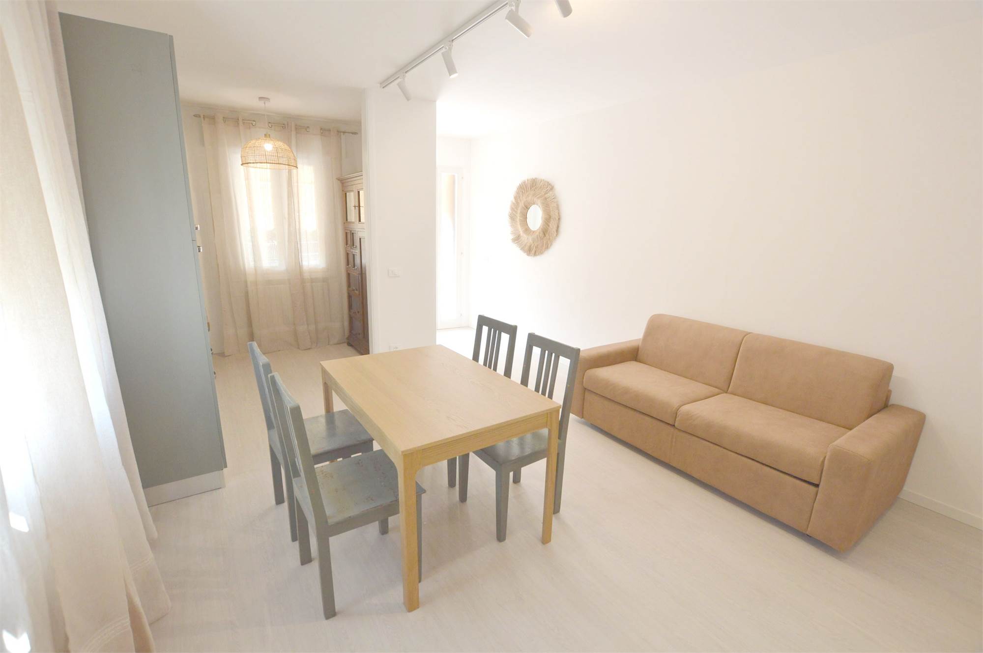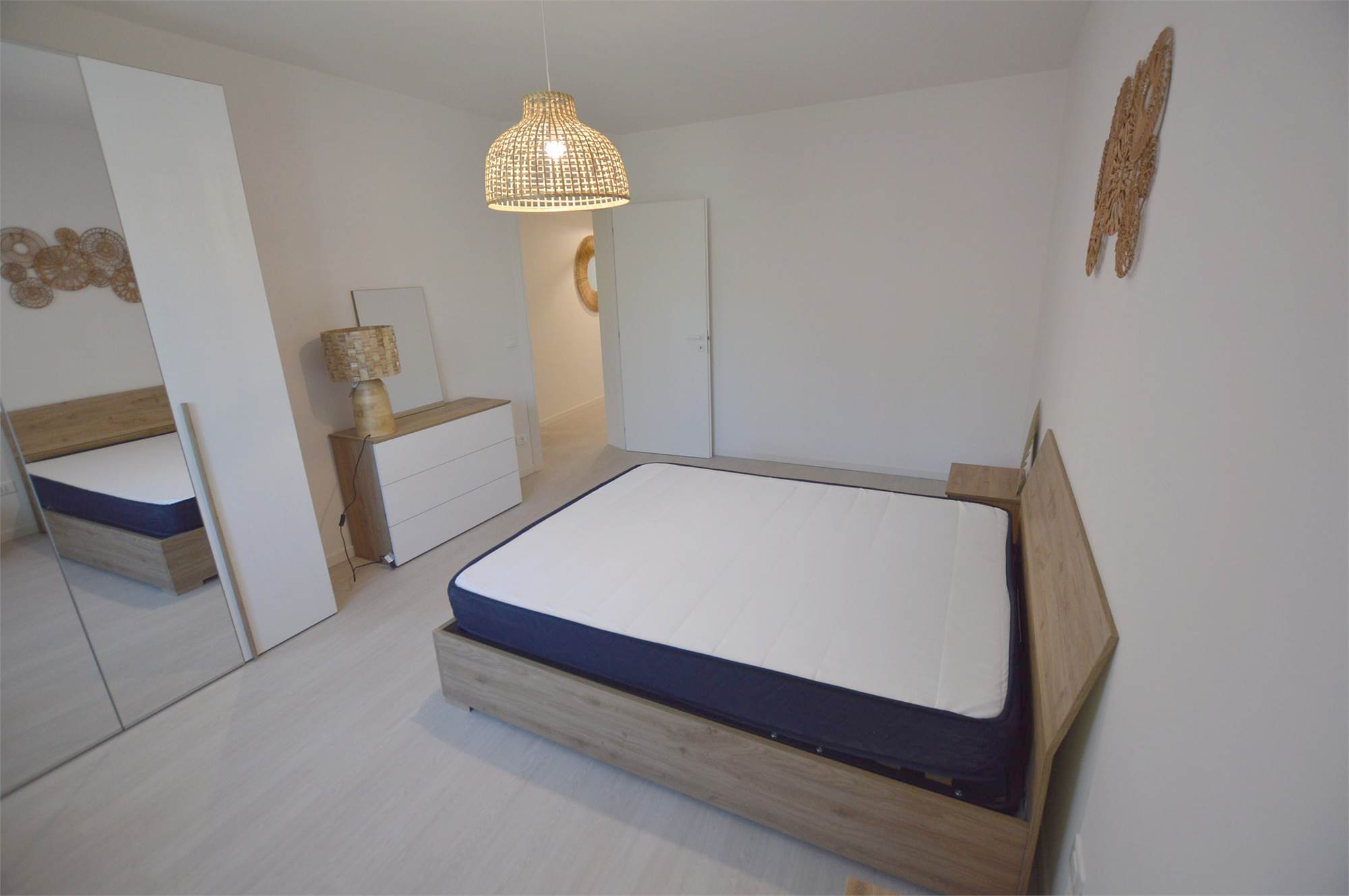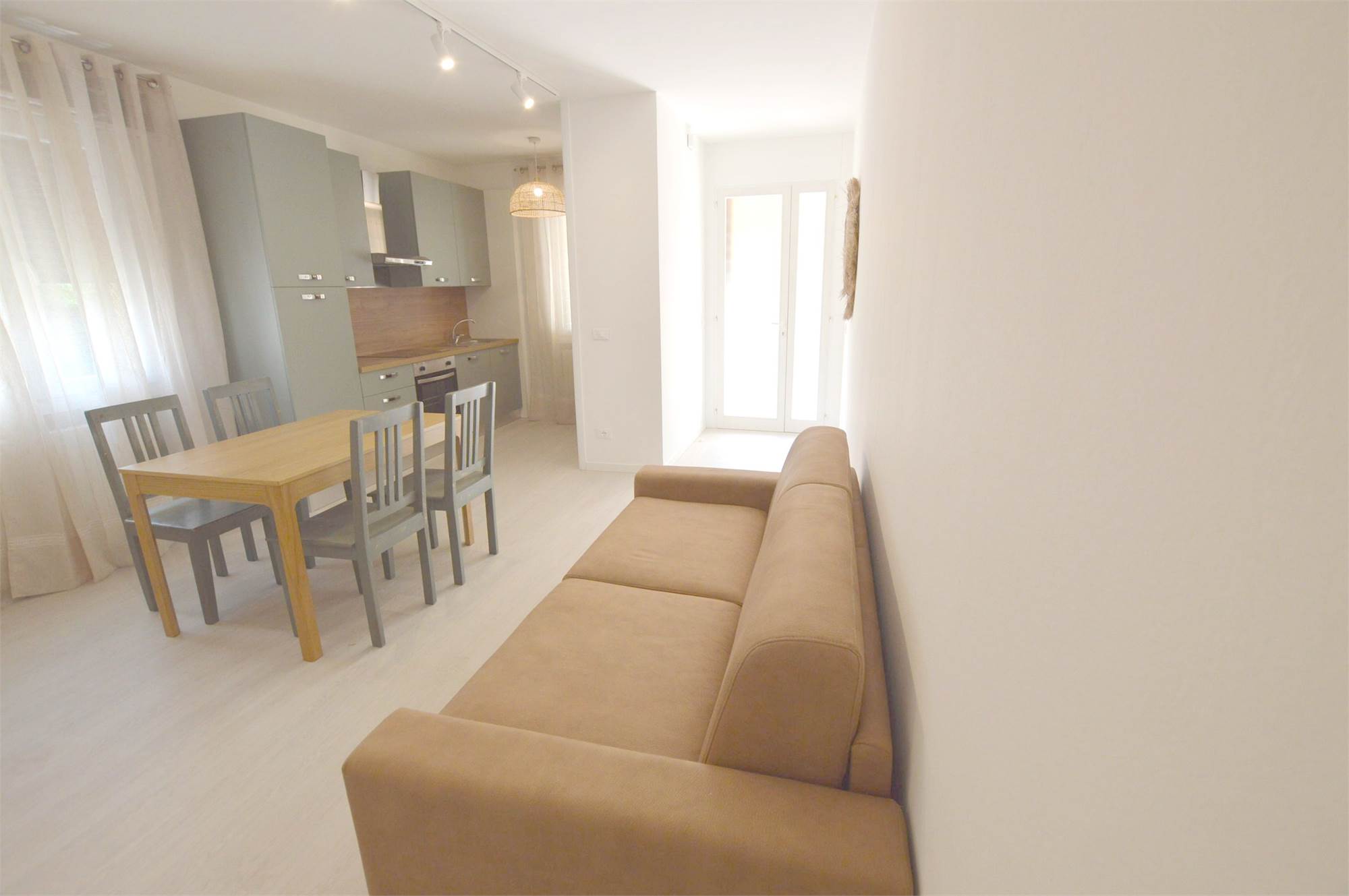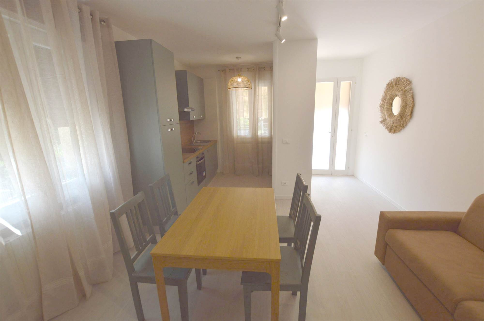 E composta al piano rialzato da: ingresso soggiorno, cucinino, un bagno e due camere da letto.
