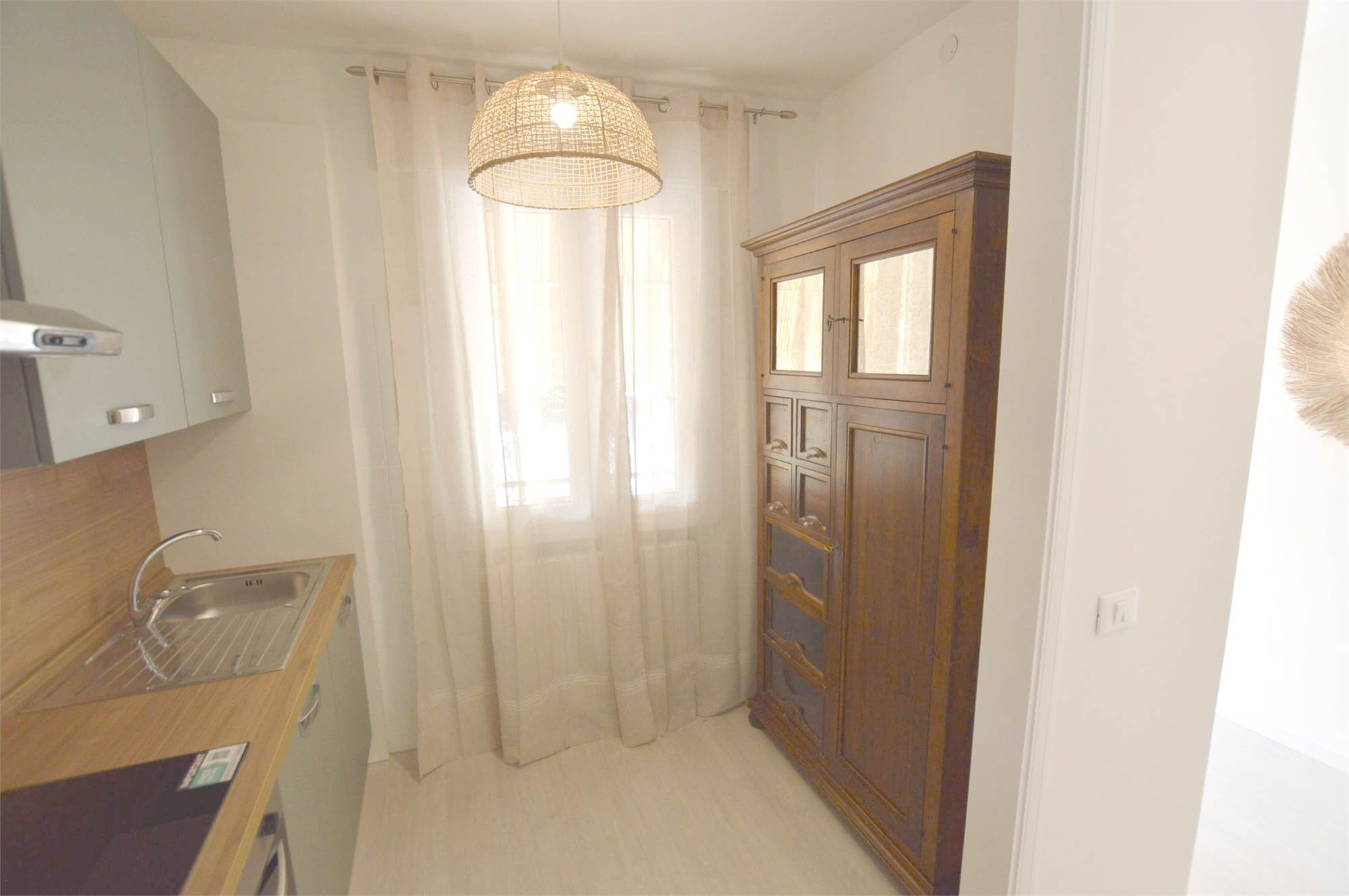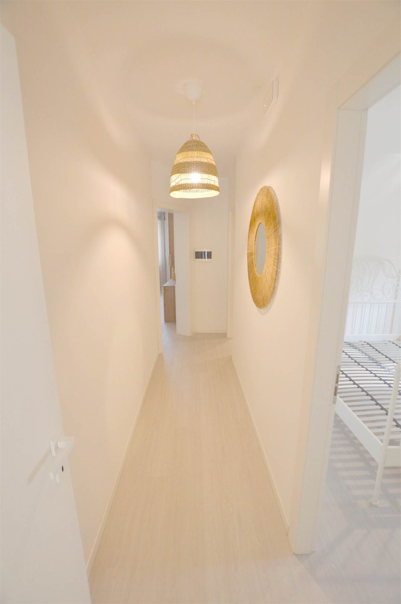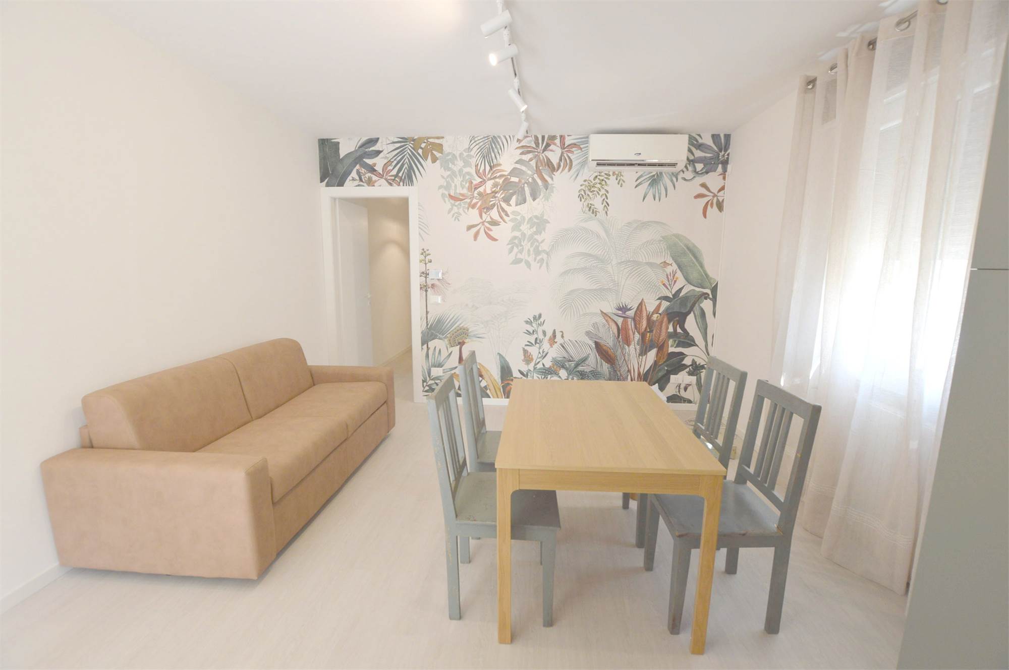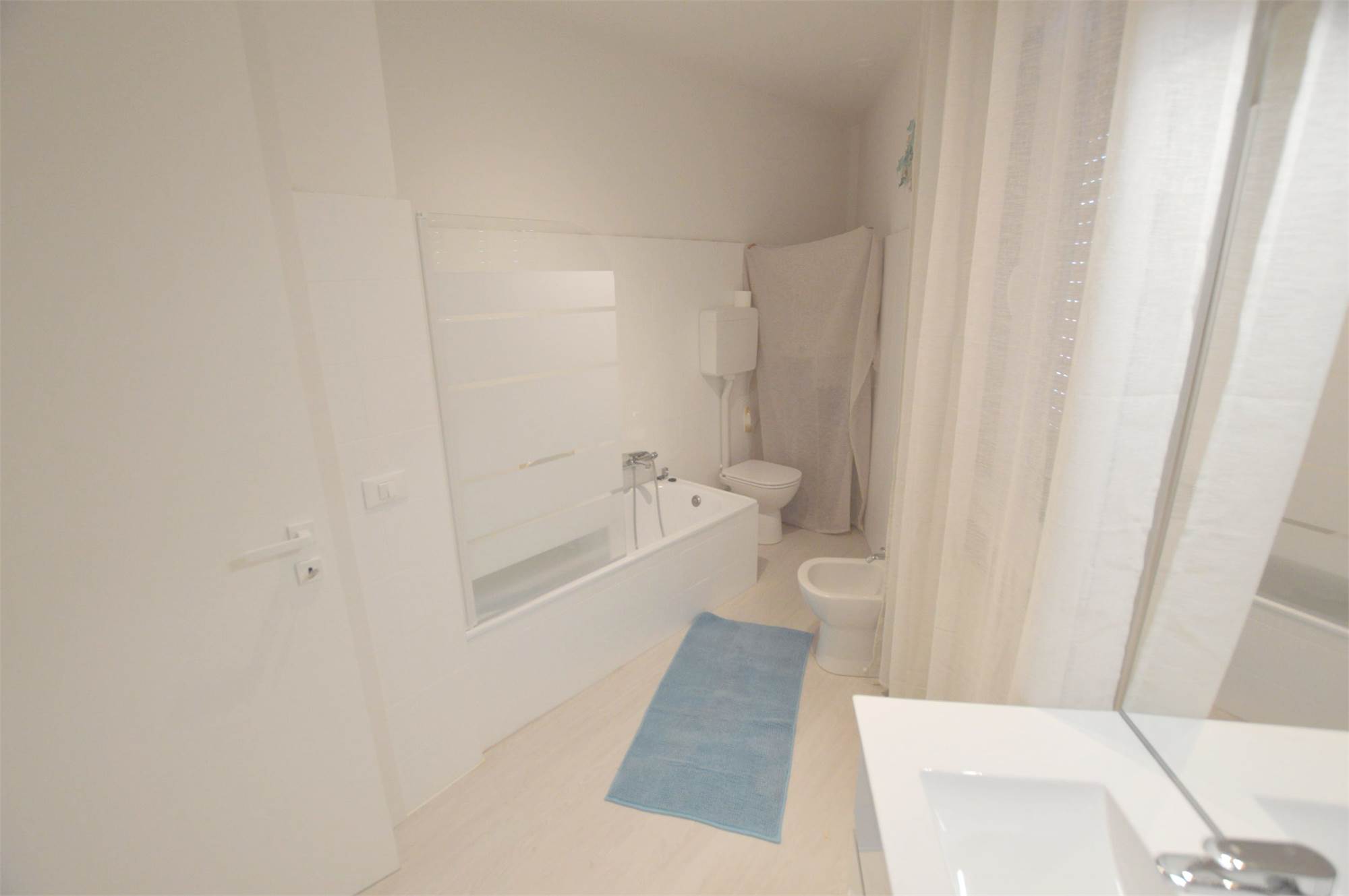 E composta al piano rialzato da: ingresso soggiorno, cucinino, un bagno e due camere da letto.